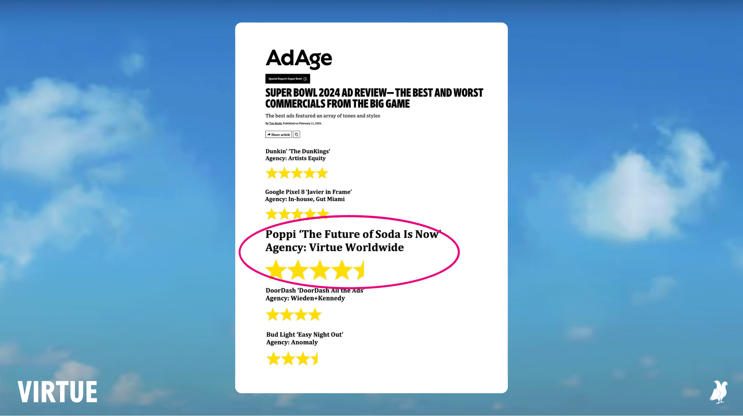 We created an ad that introduced the world to poppi, a change-maker and challenger in soda. We had no idea the commercial would be aired during the superbowl until three days before the game. We worried that because the spot featured no celebrities, no fanfare, and no fireworks, it may not perform. However, due to it’s straight-forward messaging, it’s modern aesthetic, and production design, we showed 29.1 million people that poppi was a player in the soda category that couldn’t be ignored.